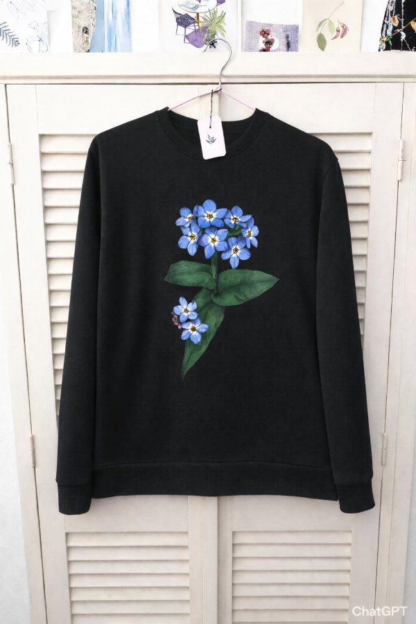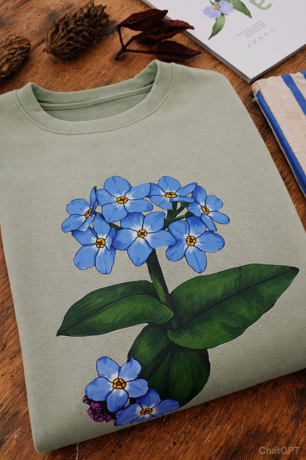 Buzo de friza verde bosque con ilustración de No me olvides o su versión en negro.